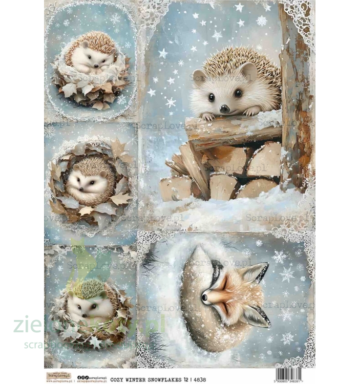 Papier ryżowy A4 do decoupage Scraplove Ośnieżona przytulna zima 10 jeże lis