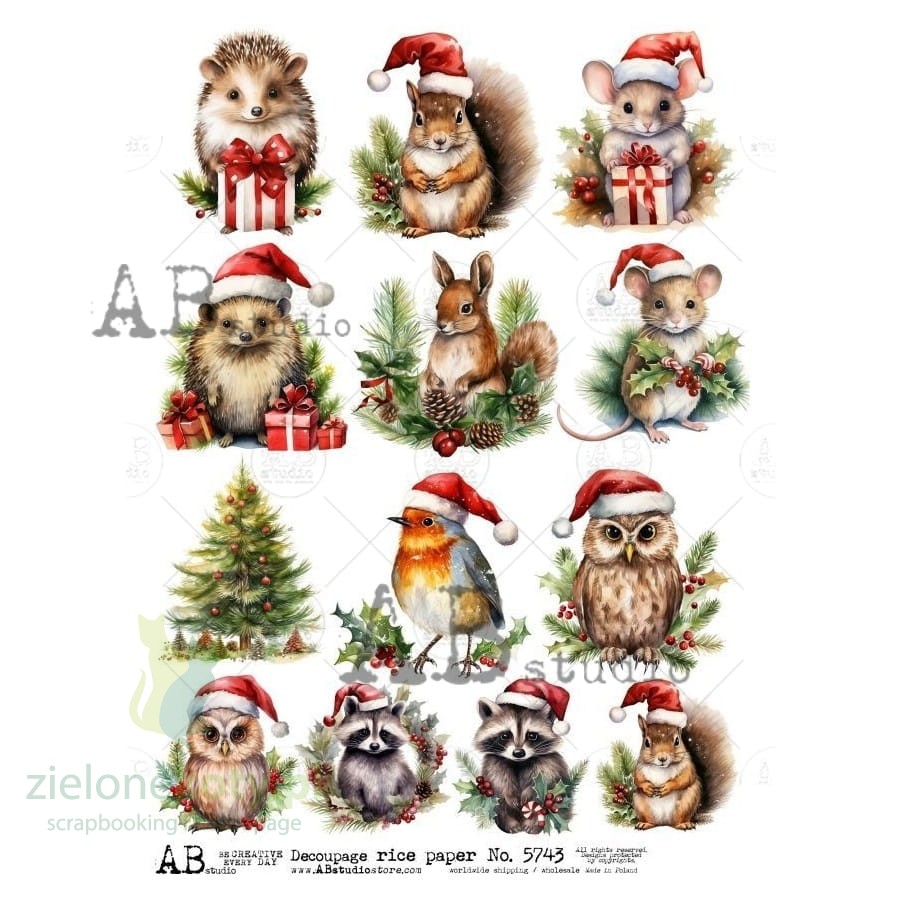Papier ryżowy decoupage AB Studio A4 świąteczne leśne zwierzęta bożenarodzenie