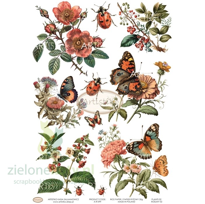 Papier ryżowy A4 do decoupage Artistiko Plants 02 rośliny, owady