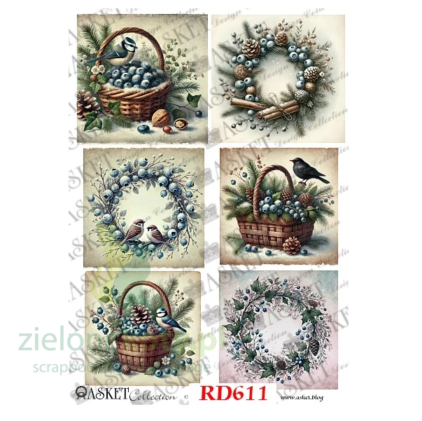 Papier Ryżowy do Decoupage Asket borówki, wianek, stroik, koszyl
