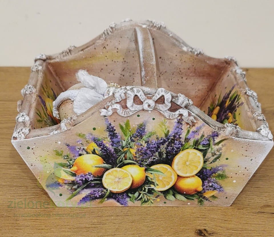 Ten papier ryżowy z motywem cytryn i lawendy świetnie sprawdzi się w pracach o tematyce letniej, kuchennej, kulinarnej decoupage oraz w art journalu.. Doskonale nadaje się zarówno zarówno do małych projektów takich jak szkatułka decoupage , jak i większych dekoracjach wnętrzarskich.