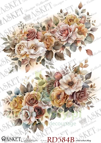 Ten papier ryżowy do decoupage został zaprojektowany i wyprodukowany przez Asket, jedną z najbardziej znanych i lubianych dekupażystek. Asket należy do prekursorek techniki decoupage w Polsce, jest znana z przepięknych projektów decoupage w stylu vintage, perfekcyjnego cieniowania i postarzania.