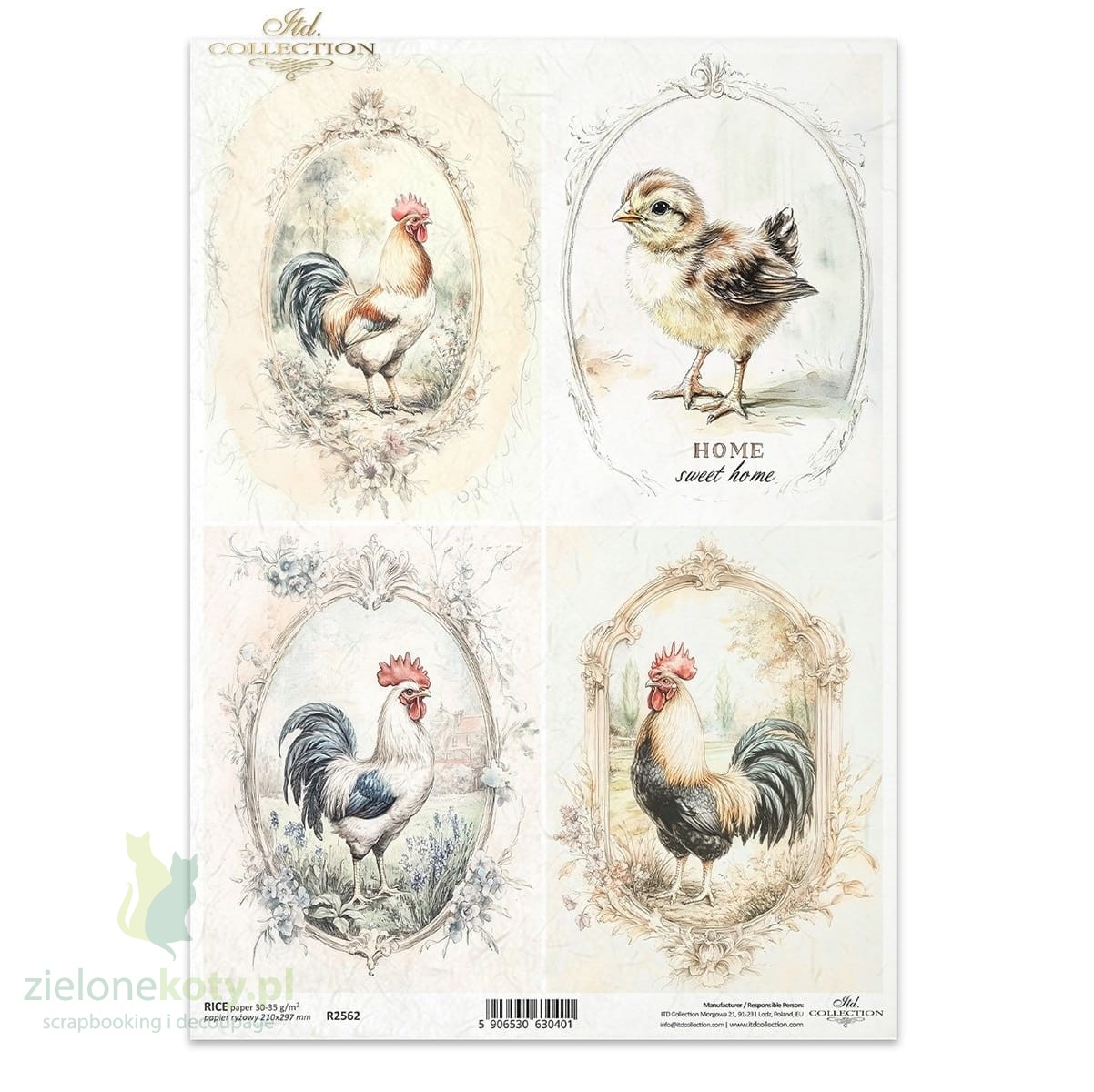 Papier ryżowy decoupage ITD Collection A4 koguty w ramkach