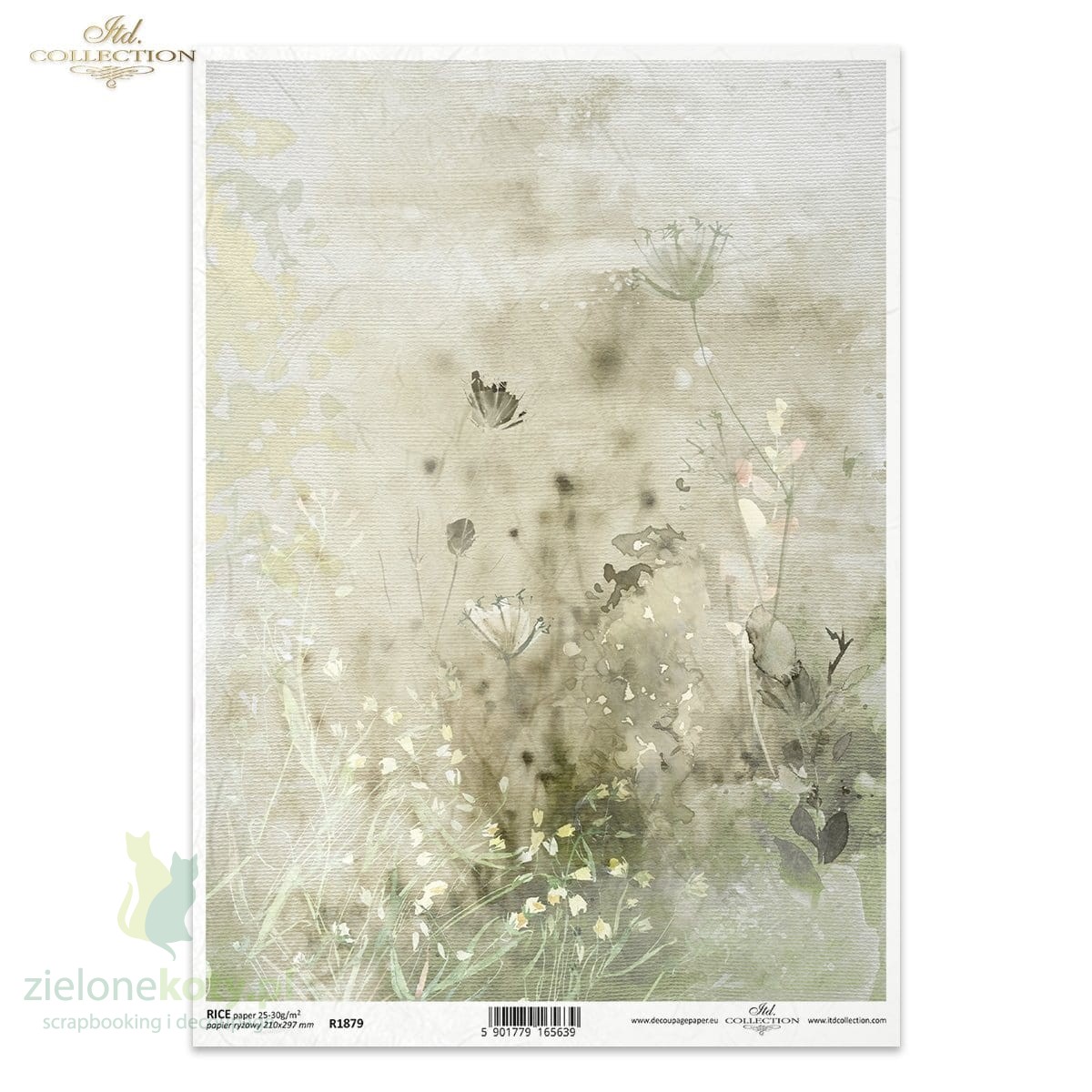 Papier ryżowy decoupage ITD Collection A4 kwiaty akwarela zielone x