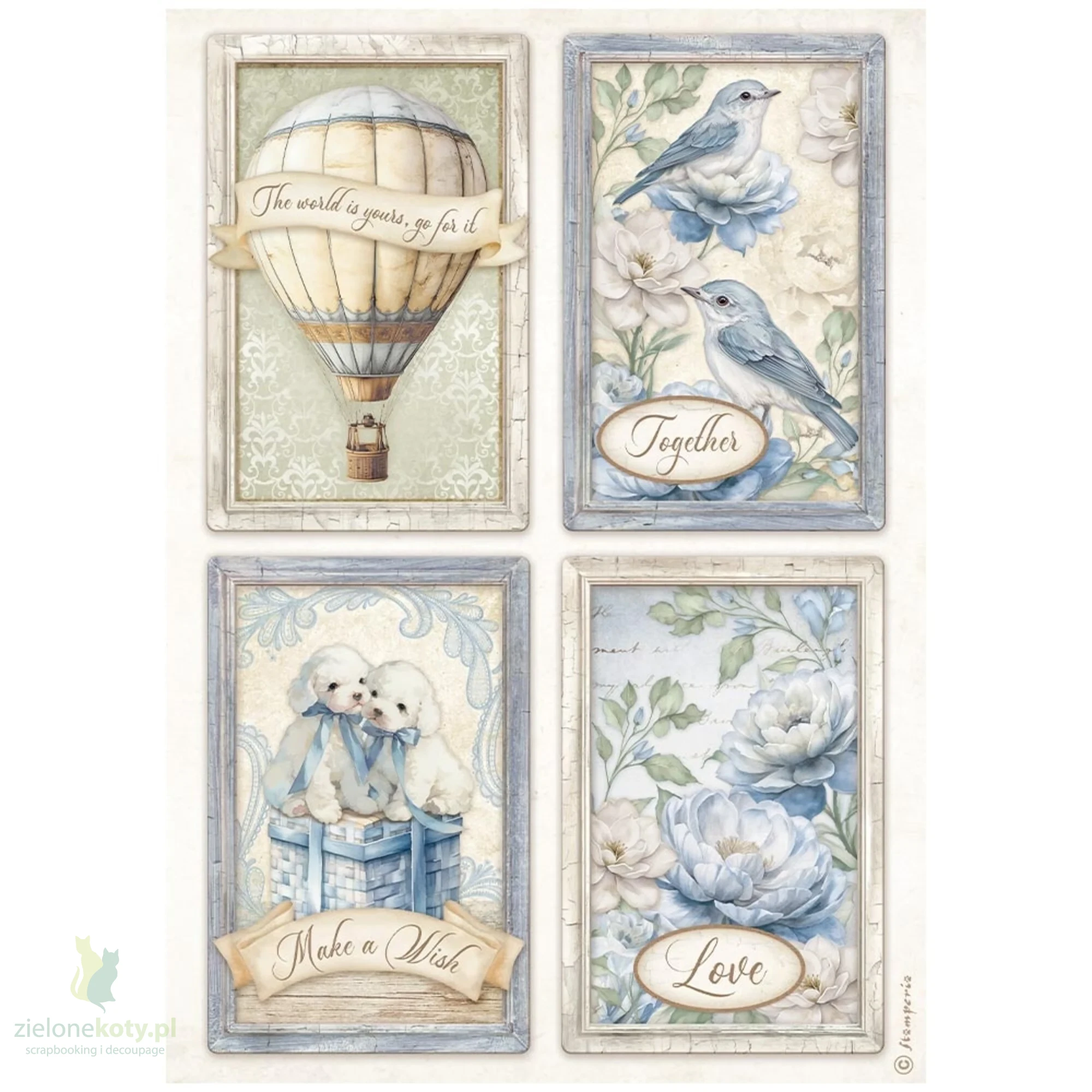 Papier ryżowy decoupage Stamperia A4 Timeless 4 cards pieski ptaki balon