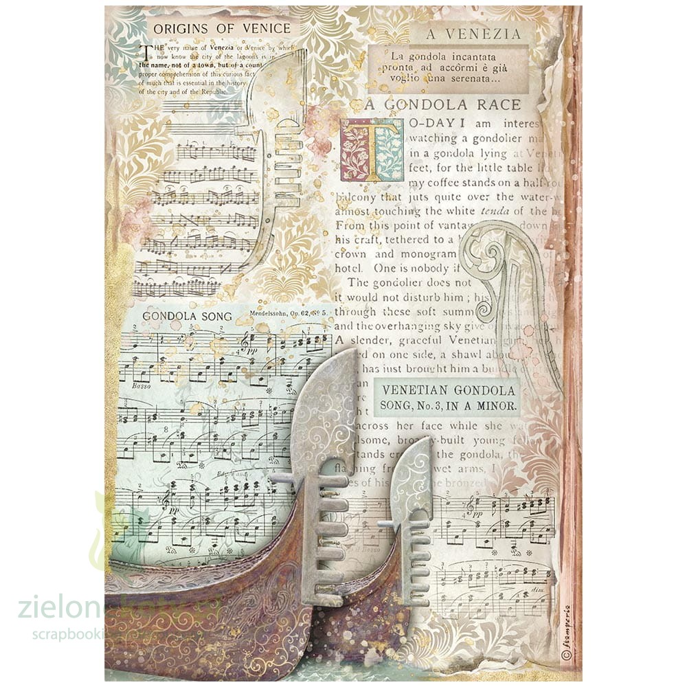 Papier ryżowy A4 do decoupage Stamperia Venice - napisy nuty, tło, gondola