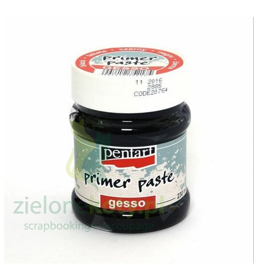 Pentart Primer Paste Gesso to dobrze pokrywająca farba podkładowa do gruntowania powierzchni porowatych (papier, drewno, ceramika itp.) Świetnie przylegająca i izolujaca od wilgoci. Zaleca się pokrycie gesso przedmiotów porowatych przed pracą innymi mediami. Zagruntowanie gesso ozdabianej powierzchni zmniejsza jej podatność na chłonięcie farb oraz zwiększa ich przyczepność. BARDZO GĘSTA, konsystencja pasty.