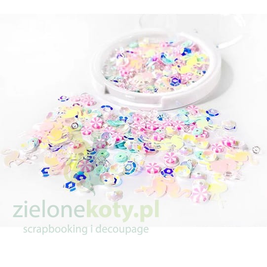 Piękne, mieniące się cekiny o różnych wielkościach oraz ozdobnych kształtach.