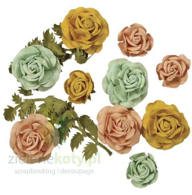 Kwiatki papierowe Little Birdie róże żółte, brzoskwiniowe i miętowe, lekko posypane złotym brokatem