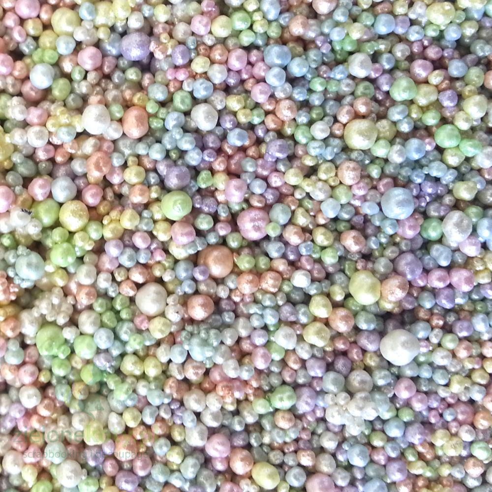 Perłowe plastikowe kuleczki, drobne o różnej wielkości, w słoiczku o wysokości 3cm i średnicy3cm.