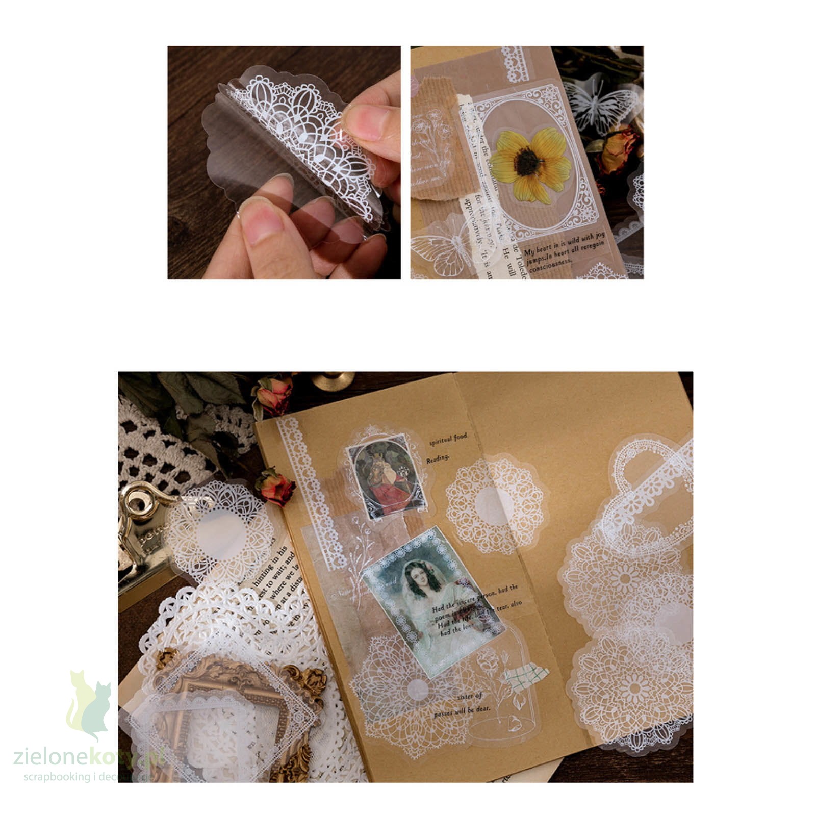 Naklejki po odklejeniu z folii można nakleić w dowolnym miejscu swojej pracy - stanowa ciekawy element uzupełniający tło, moga podkreślać jakiś motyw pracy czy zdjecie (jako ramka). Ale można je wykorzystać także bez odklejania z folii - jako przezroczysty element kompozycji 3D na kartce, tagu czy w abumie.