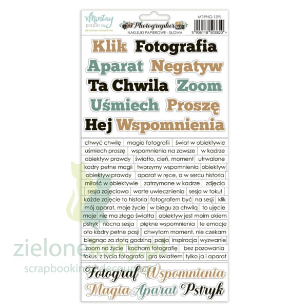 Zestaw papierowych naklejek do scrapbookingu z napisami. Elementy umieszczone są na arkuszu i wycięte po obrysie.