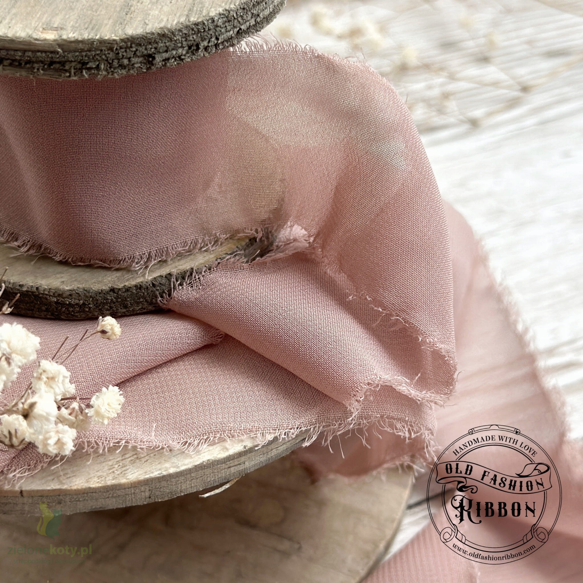Wstążka o jedwabnej fakturze szyfonu, lekka i bardzo miła w dotyku, z miękkim postrzępionym brzegiem.