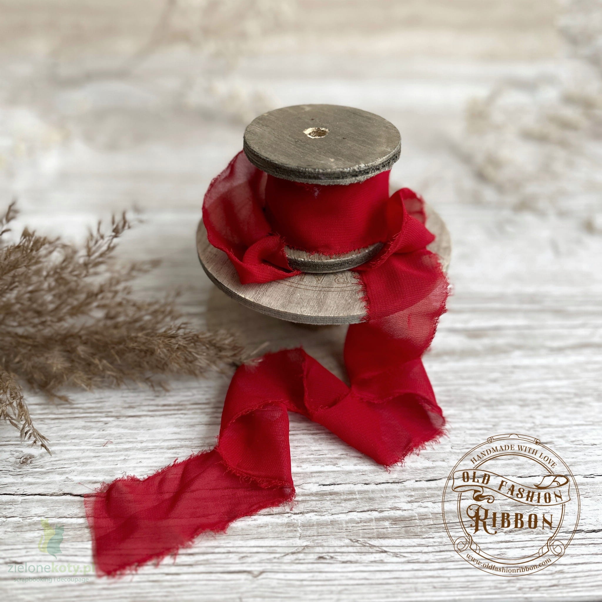 Wstążka o jedwabnej fakturze szyfonu, lekka i bardzo miła w dotyku, z miękkim postrzępionym brzegiem.