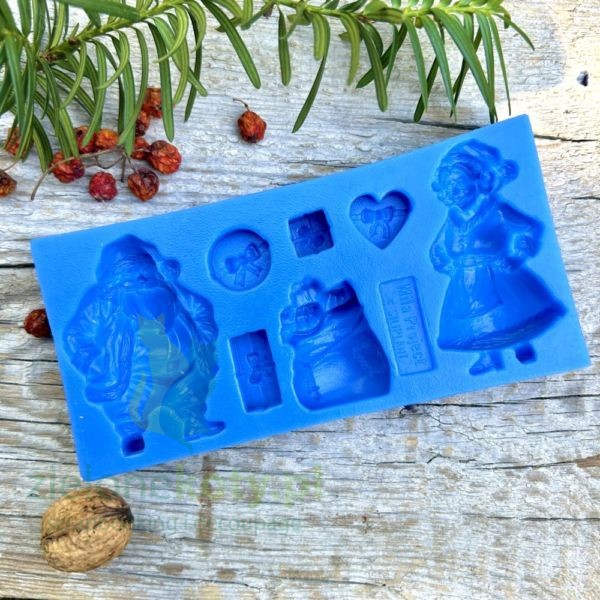 - Foremka: 13,1 x 6,5 cm, grubość 1,6 cm Odlew: Mikołaj: 5,5 cm x 4 cm, gr. 1,4 cm, Mikołajowa: 5,8 x 3,3 x 1,3 cm, worek: 3,4 cm x 2,6 cm, gr. 1,4 cm, prezenciki: ok. 1,2 cm