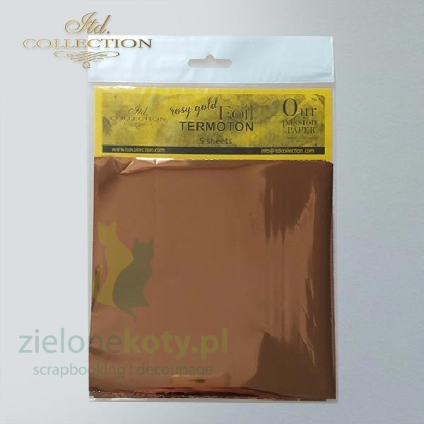Folia do złoceń Termoton marki ITD Collection to wysokiej jakości folia, przeznaczona do tworzenia efektownych złoconych dekoracji i detali w technikach scrapbookingu, cardmakingu, decoupage oraz mixed media. Pozwala uzyskać trwały, metaliczny połysk – wystarczy użyć jej z maszynką do foliowania, klejem lub specjalnym medium, dwustronną taśmą.