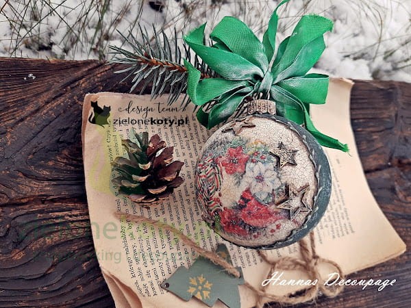 Bombka świetnie nadaje sie do zdobienia metodą decoupage, ale też innymi technikami - np. mixed mediowymi. Należy pamiętać, aby przed zdobieniem farbami pokryć ją podkładem  (primerem) do powierzchni gładkich).