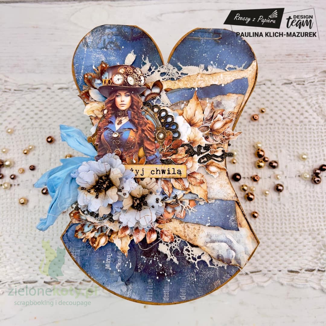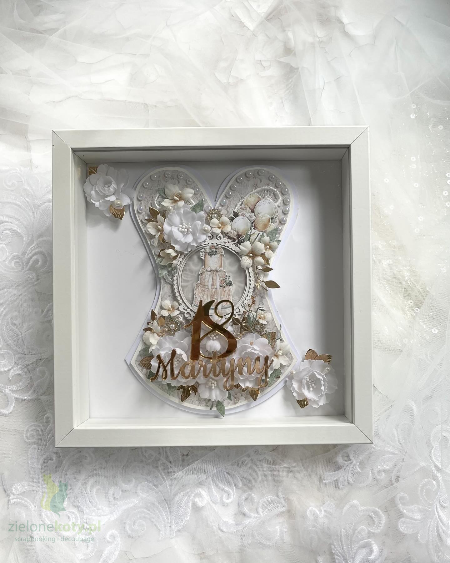 Baza w kształcie gorsetu. Wykonana z papieru o gramaturze 300gm2. Baza jest bigowana co ułatwia składanie. Nadaje się do zdobienia różnymi materiałami: mediami, papierami do scrapbookingu itp. Pasuje do koperty lub pudełka A5.