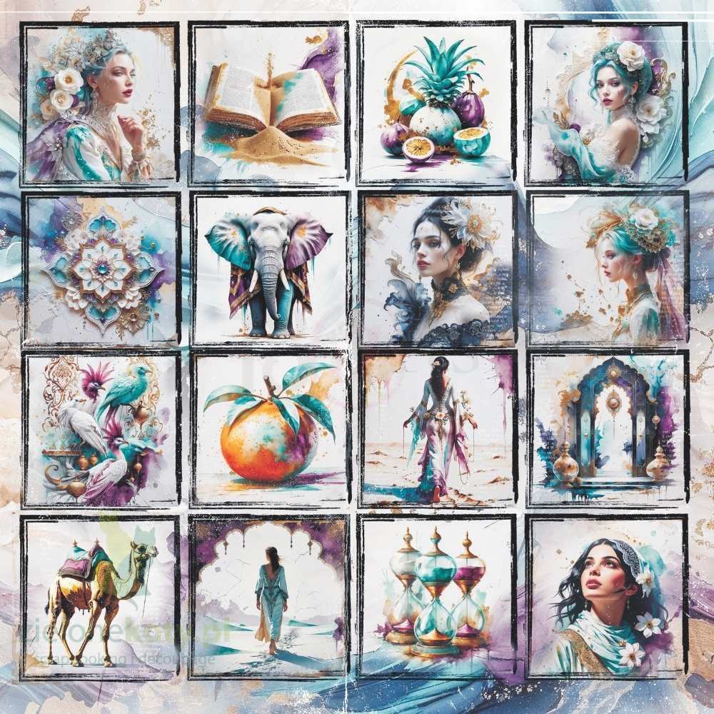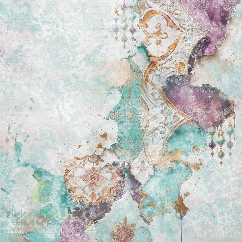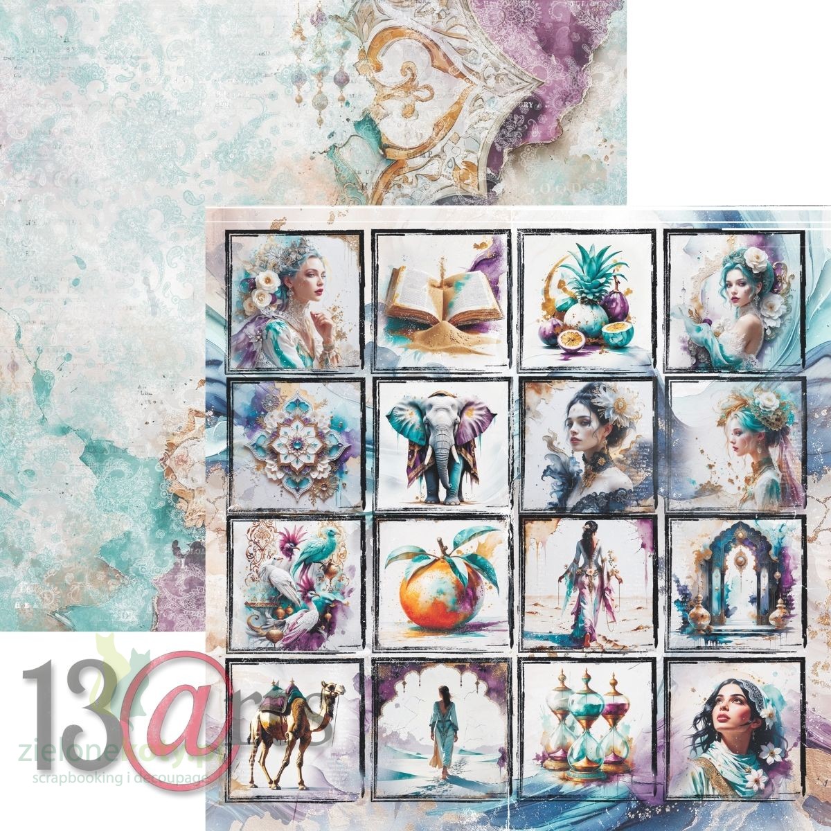 Kolekcja papierów do scrapbookingu 13Arts – Tales of the Sand to zestaw dekoracyjnych papierów stworzonych z myślą o projektach inspirowanych podróżami, naturą i orientem. Kolekcja wyróżnia się ciekawą paletą kolorów: połączenie delikatnego beżu z intensywnymi odcieniami turkusu i fioletu oraz wschodnimi, bajecznymi motywami.