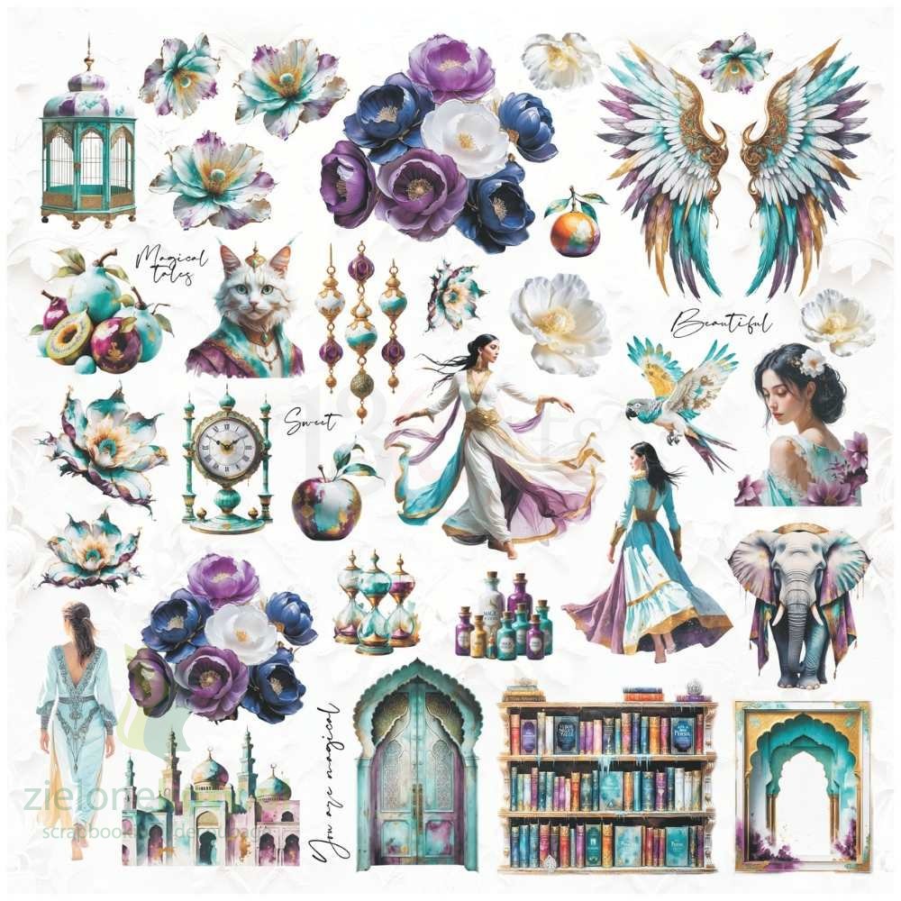 Kolekcja papierów do scrapbookingu 13Arts – Tales of the Sand to zestaw dekoracyjnych papierów stworzonych z myślą o projektach inspirowanych podróżami, naturą i orientem. Kolekcja wyróżnia się ciekawą paletą kolorów: połączenie delikatnego beżu z intensywnymi odcieniami turkusu i fioletu oraz wschodnimi, bajecznymi motywami.