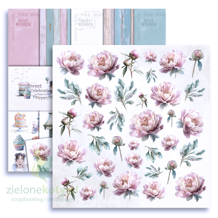 Kolekcja Sweet Celebration od UHK Gallery to piękne, artystyczne papiery do scrapbookingu, w pastelowych kolorach błękitu, kremu i różu, pełne imprezowych motywów, kwiatów piwonii i akwarelowych ilustracji.