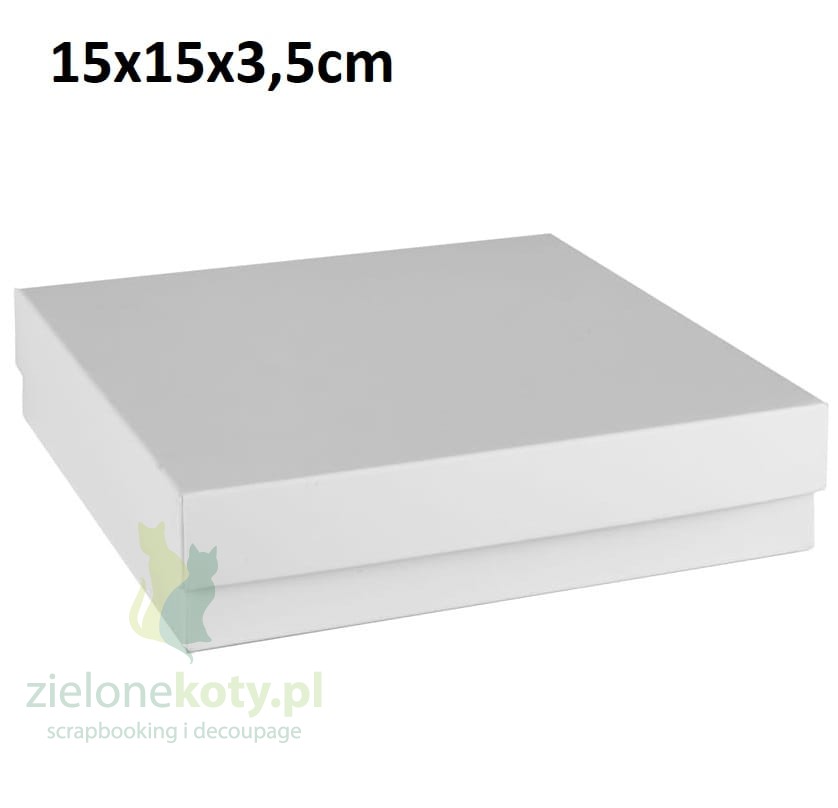 Rozmiar 15x15x3,5 cm wykonane z papieru białego offset ,bezdrzewnego o gramaturze 300gm2. Składa się z dwóch części wieczka i spodu. Obie części są bigowane co ułatwia składanie. Wieczko jest niższe od spodu o 0,5cm co ułatwia swobodne otwieranie. Idealnie nadaje się do ręcznie zdobionych kartek okolicznościowych, zaproszeń, podziękowań. Sprawdzi się również jako opakowanie do ręcznie robionej biżuterii itp. Pudełko nadaje się do zdobienia różnymi materiałami: mediami, papierami do scrapbookingu.
