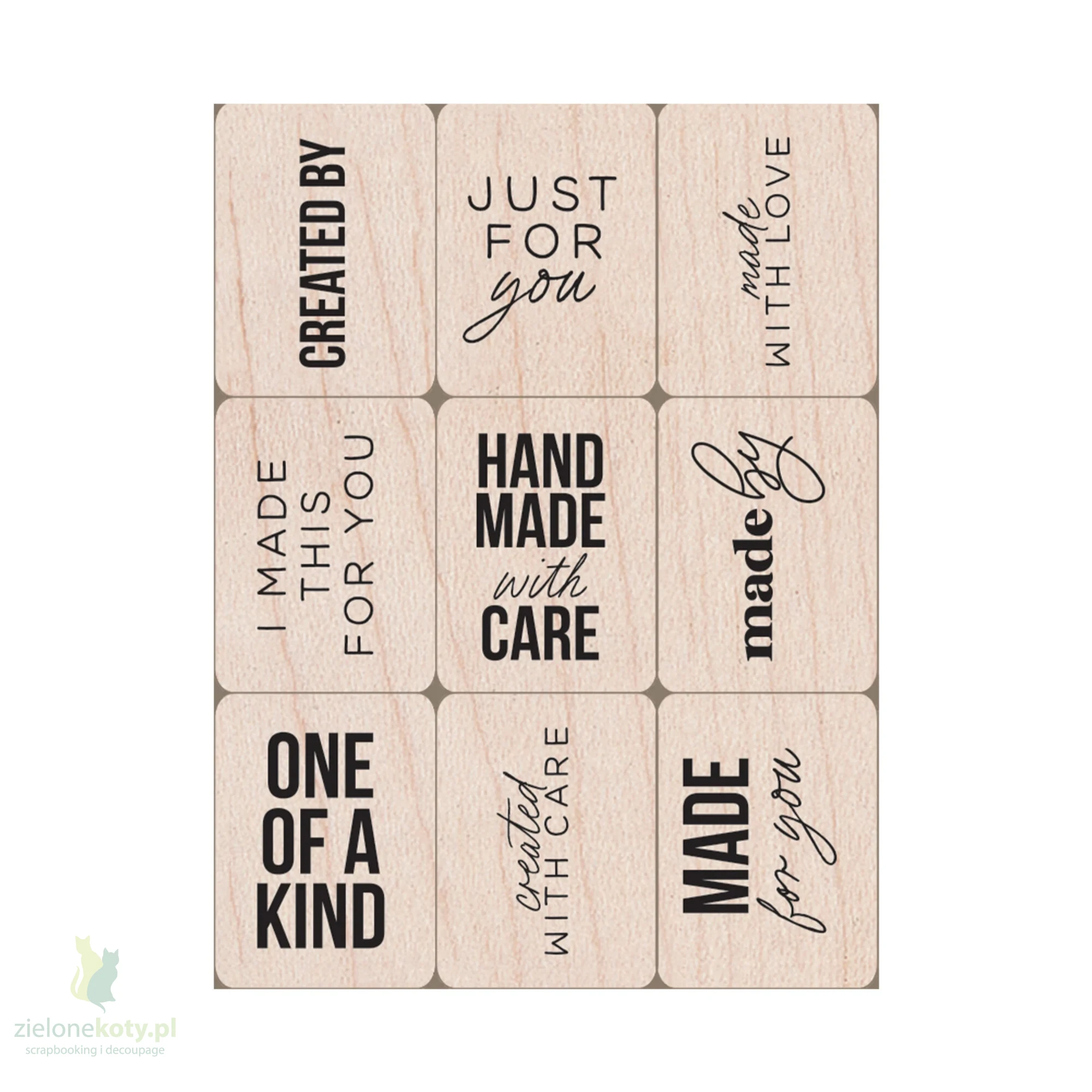 Zestaw stempli gumowych montowanych na drewnianym bloczku Hero Arts Napisy w stylu "handmade", "just for you"