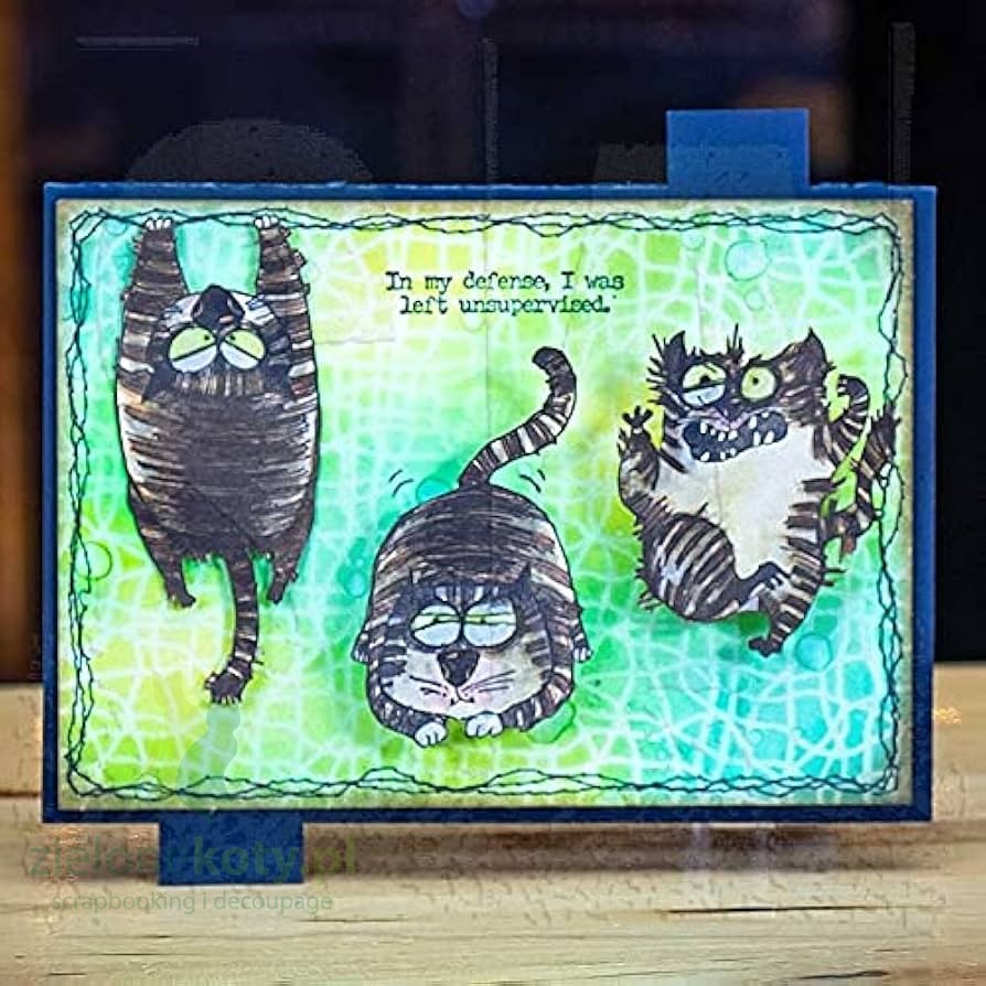 - Wzory typowe dla technik mixed media - stemple zabawne koty i napisy, szablon kropki, bazgroły