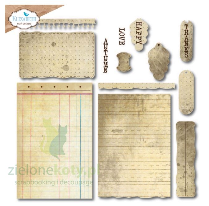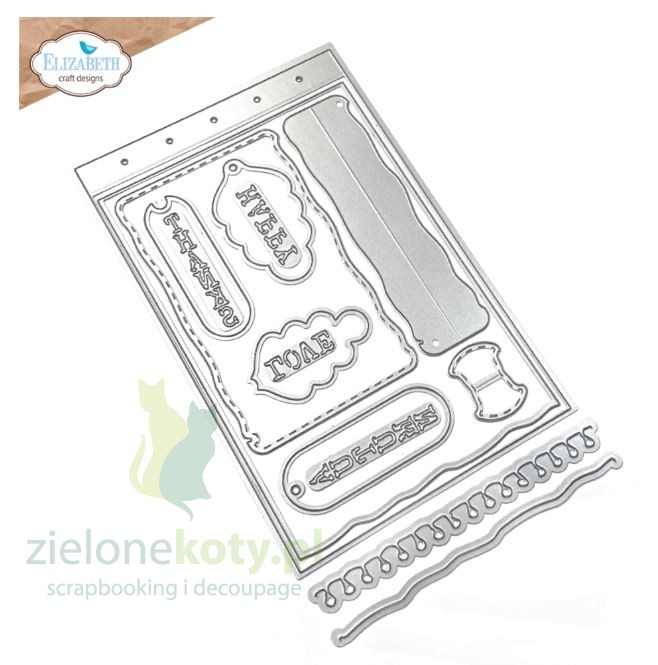 Wykrojnik do scrapbookingu Elizabeth Build a Journal - elementy, z których stworzysz stronę notatnika, albumu, journala: strona, wykrojniki brzegowe, etykieta, napisy