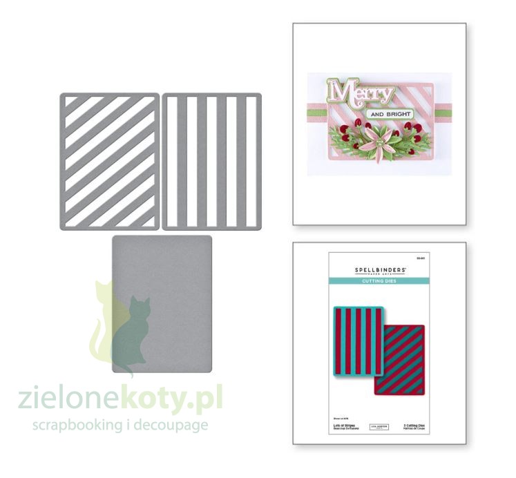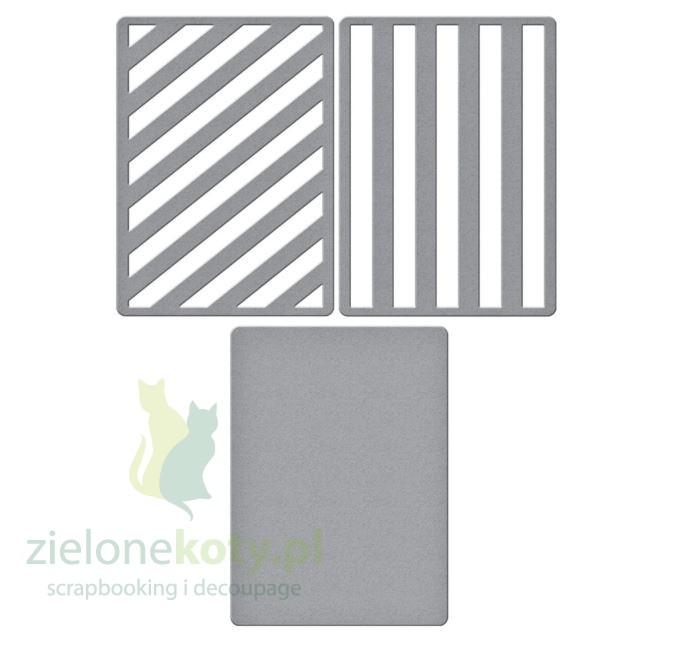Wykrojnik do scrapbookingu Spellbinders Lots of Stripes to zestaw elementów: prostokątne tło i dopasowany wzór rozmiarem wzór pasków