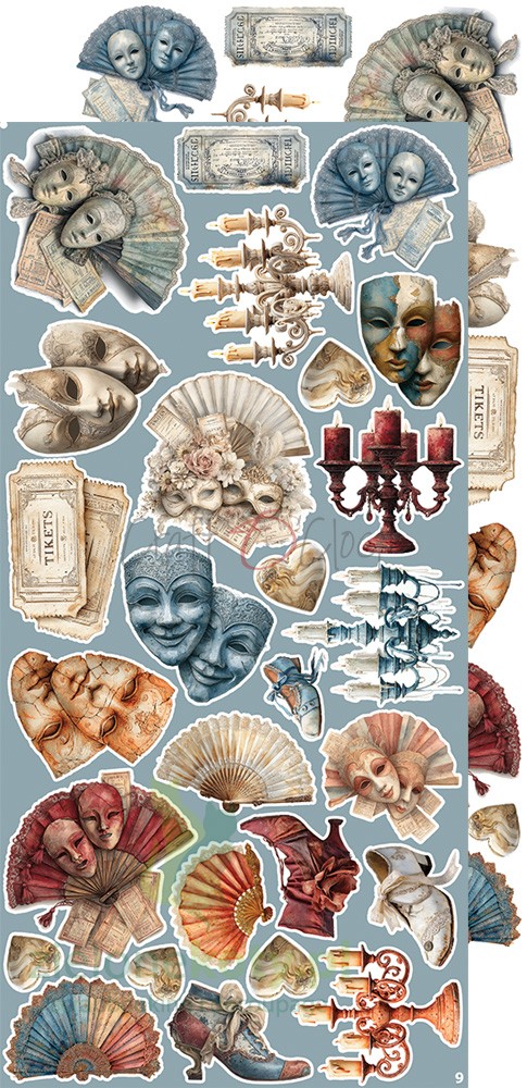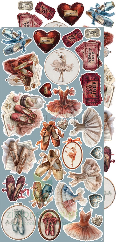Zestaw papierów do scrapbookingu z dodatkami do wycinania Craft o'clock Timeless Grace - wybór dodatków pasujących stylistycznie i kolorystycznie do całej kolekcji: kwiaty, pudła, torty, baletnice, maski teatralne