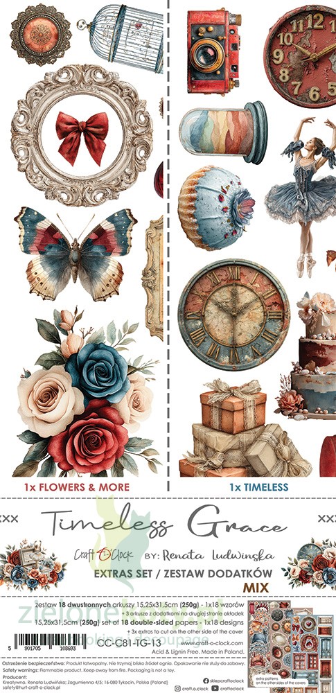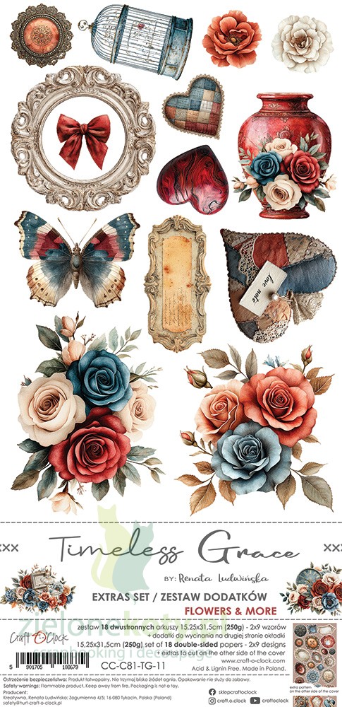 Timeless Grace to kolekcja papierów do scrapbookingu marki Craft O’Clock, w której udało się w subtelny sposób połączyć barwy koralowe, niebieskie i beżowe. Pełna kwiatowych kompozycji, spękanych teł oraz vintagowych motywów: teatralnych masek, pozytywek, zegarów, baletnic idealnie sprawdzi się w artystycznych projektach w stylu retro.