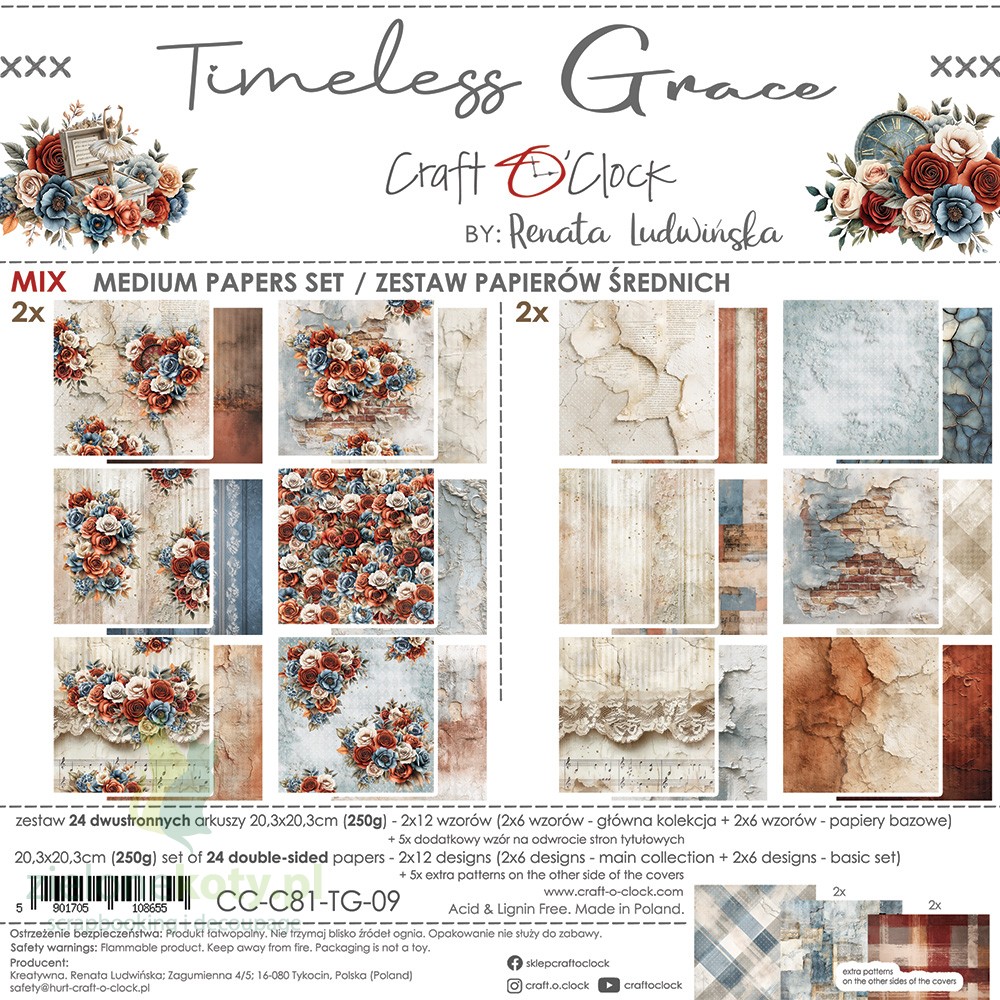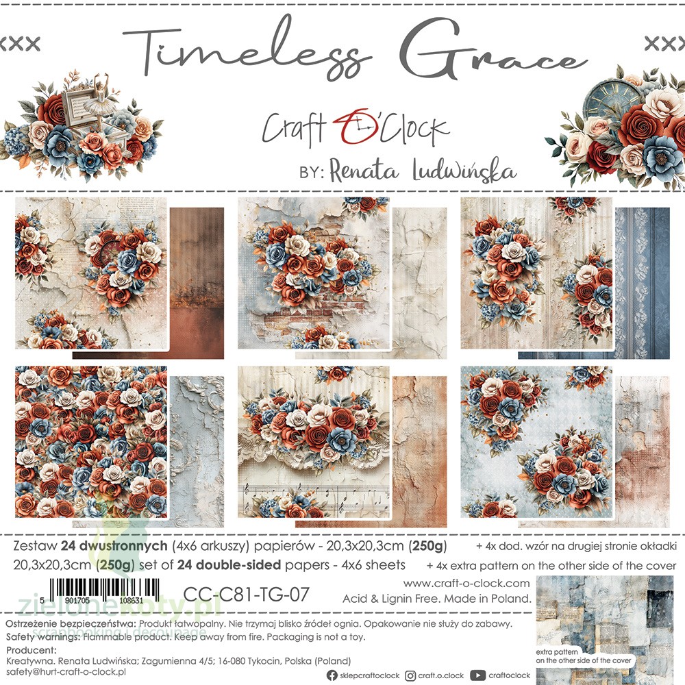 Timeless Grace to kolekcja papierów do scrapbookingu marki Craft O’Clock, w której udało się w subtelny sposób połączyć barwy koralowe, niebieskie i beżowe. Pełna kwiatowych kompozycji, spękanych teł oraz vintagowych motywów: teatralnych masek, pozytywek, zegarów, baletnic idealnie sprawdzi się w artystycznych projektach w stylu retro.
