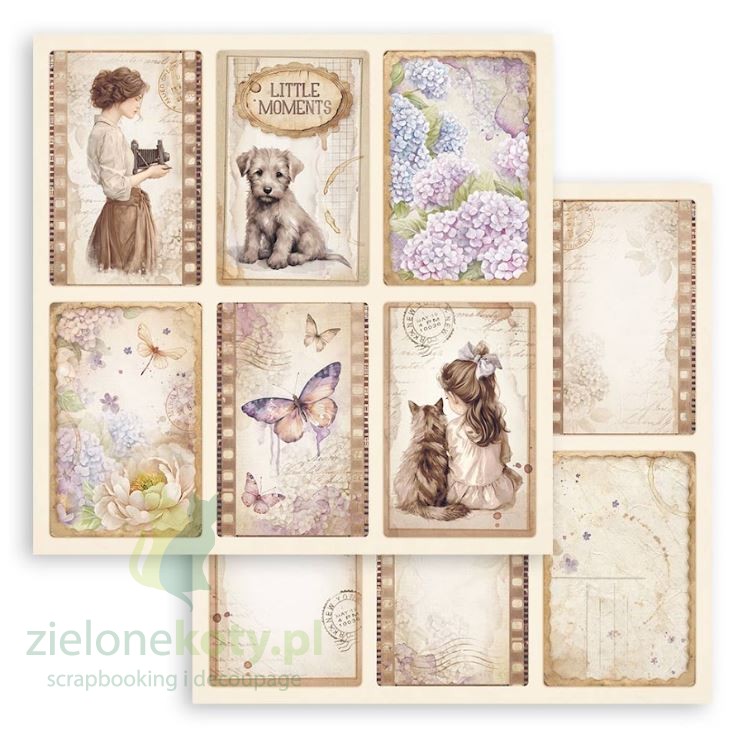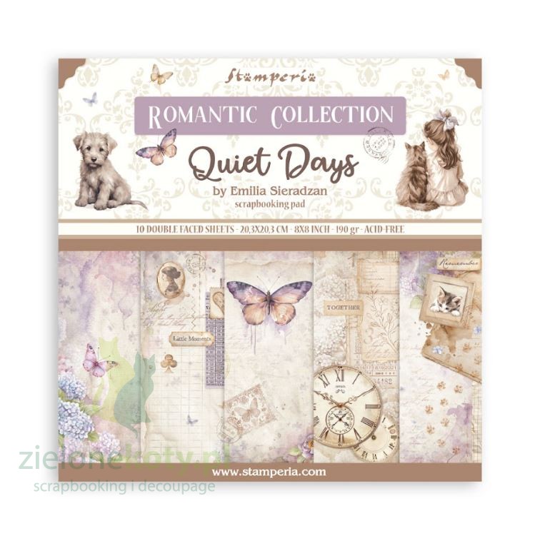 „Quiet Days” to nowa, nastrojowa kolekcja papierów i dodatków do scrapbookingu, decoupage i mixed media od marki Stamperia, która celebruje piękno prostych, spokojnych momentów. Utrzymana w subtelnej palecie lawendy, kremu i beżu, kolekcja zachwyca delikatnością i artystycznym klimatem. Wśród motywów znajdziesz hortensje, aparaty fotograficzne, maszyny do szycia, pióra i urocze zwierzęta – elementy, które przywołują atmosferę twórczego, spokojnego dnia.